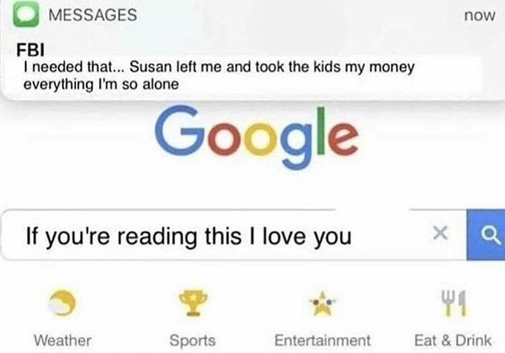 Fbi text message meme. It s a free online image maker that allows you to add custom resizable text to images. Fbi message meme is a free entertainment app. We provide fbi message meme 1 6 apk file for android 4 0 and up. Search the imgflip meme database for popular memes and blank meme templates. Fbi message meme is a free entertainment app. It operates in html5 canvas so your images are created instantly on your own device. Meme status confirmed year 2017 origin instagram tags text message fbi piracy google search about why is the fbi here is a series of images featuring screenshots of various google searches with a pop up text message notification from a father asking why is the fbi here suggesting that the united states federal bureau of investigation had been alerted to the search query.